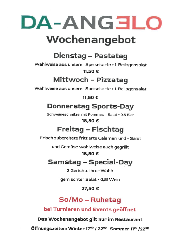 Sonntag und Montag Ruhetag - Außer Turniere / Events 11-22 Uhr